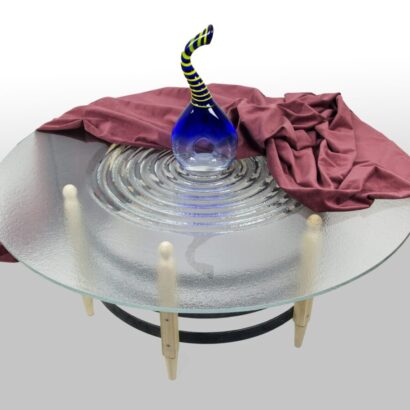 Mesa baja de café, fabricada con varios materiales, seis patas de madera torneadas de 45 cmtrs. de altura ensambladas con muelle fabricado en pletina de hierro de 40×8 y 6 metros de desarrollo, tapa de vidrio extra claro de 12mm de grosor y 120cmtrs. de diámetro termoformado en horno.