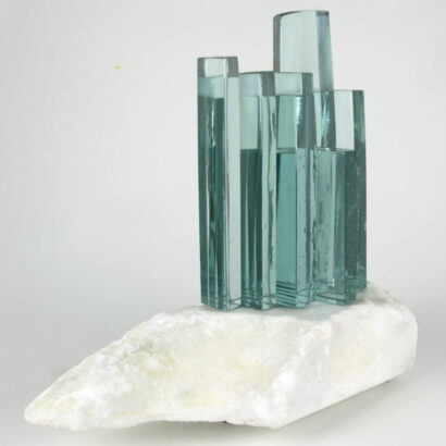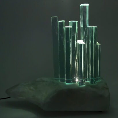 Punto de luz compuesto de vidrio Float de la gama Azzurra y mármol de Macael. El vidrio son tiras de Float de 25mm de grosor de distintas alturas y anchuras fundidas en un horno con la técnica de tack-fusing y la base es una piedra de mármol de Macael con un agujero donde se ha insertado un led para su iluminación.